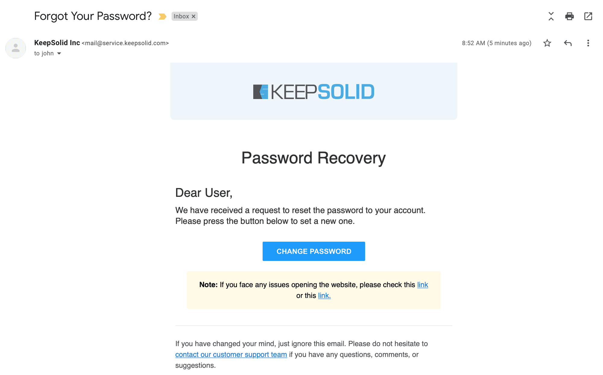 3. Проверьте ваш почтовый ящик, откройте письмо Forgot Your Password? и нажмите Change Password (Изменить пароль).