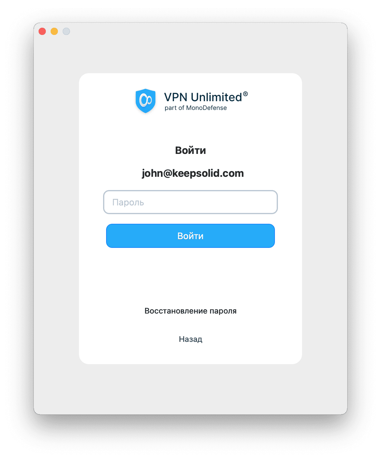 Восстановление пароля в приложении VPN Unlimited