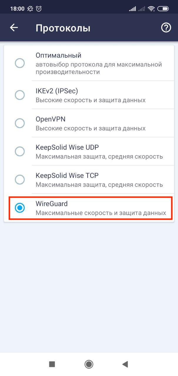 4. Выберите WireGuard® VPN протокол и вернитесь на главный экран. Для этого нажмите на стрелку в верхнем левом углу.